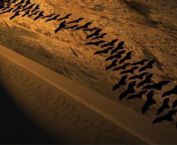 At dusk the City of Sydney’s Fruit bats create a cloud of black winged creatures as they migrate across the city; they are the last indigenous creatures left in the heart of the CBD. ''A cloud of bats’’ evokes the memories of bat migration that has existed in areas of Australia for thousands of years, while the sandstone at Argyle street reminds us of our colonial past and the amazing natural landscape that confronted early settlers.