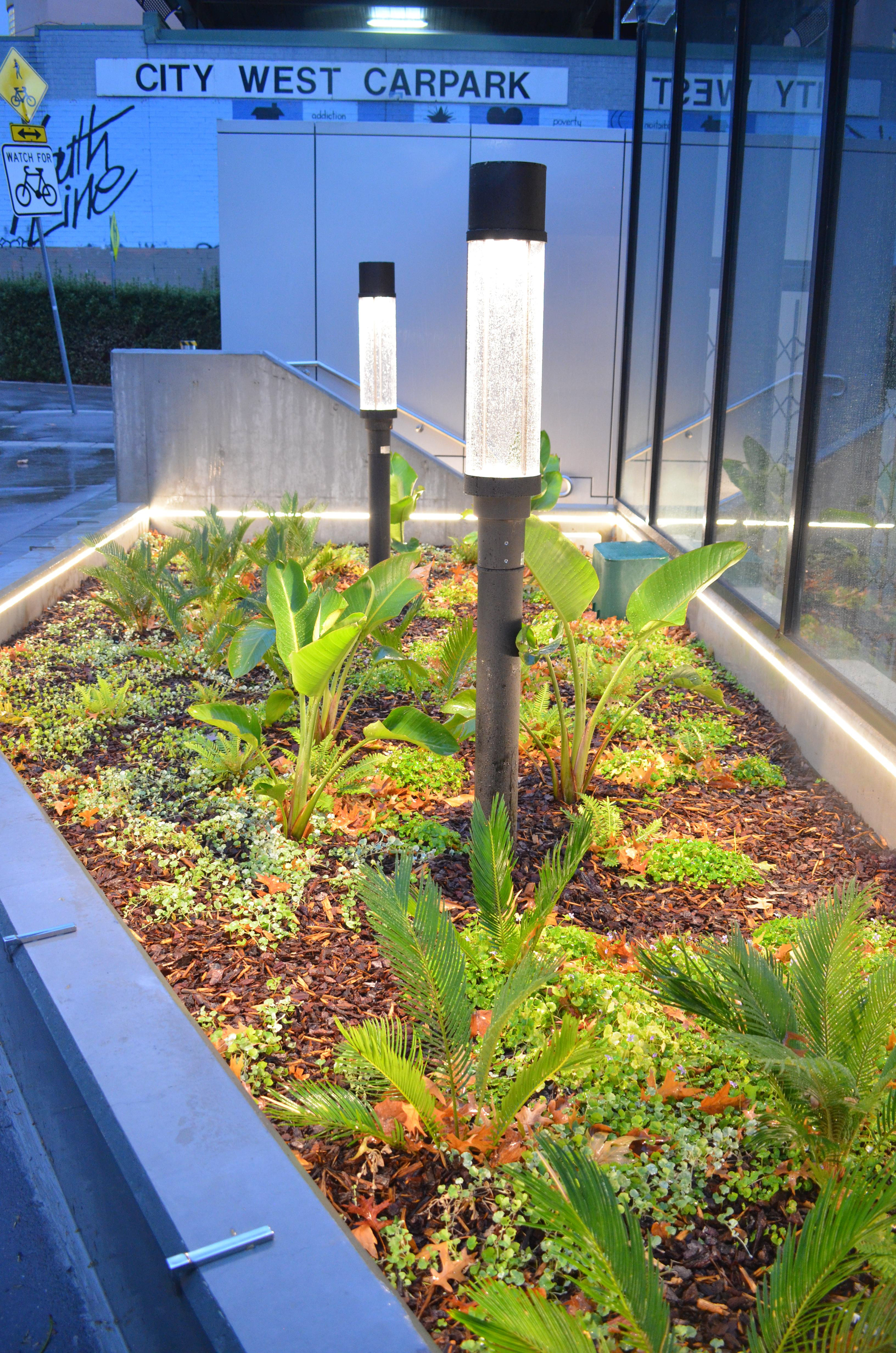 Landscape Lighting - The lighting has created an inviting Gateway to the Foyer and Hospitality activation. Gardens often are left in darkness at night have been enlightened as a main landscape feature.