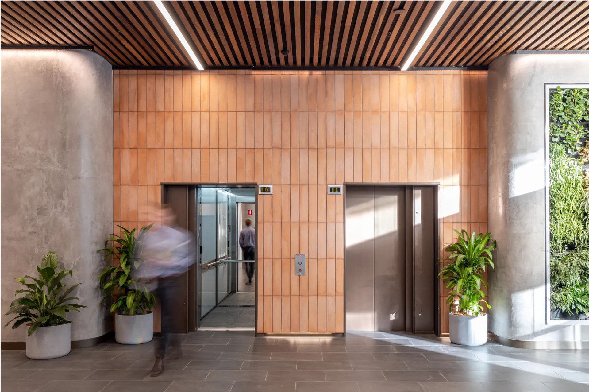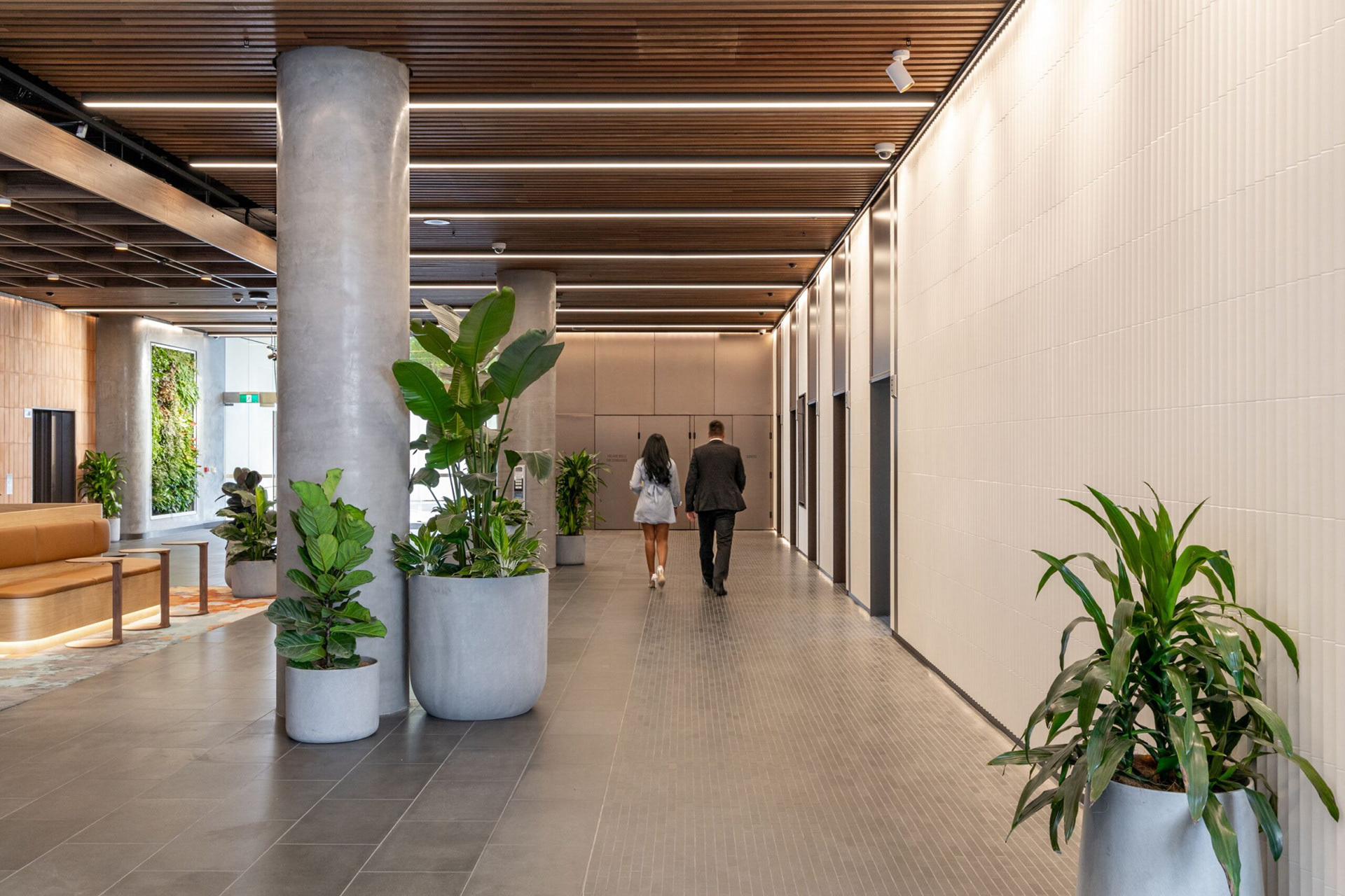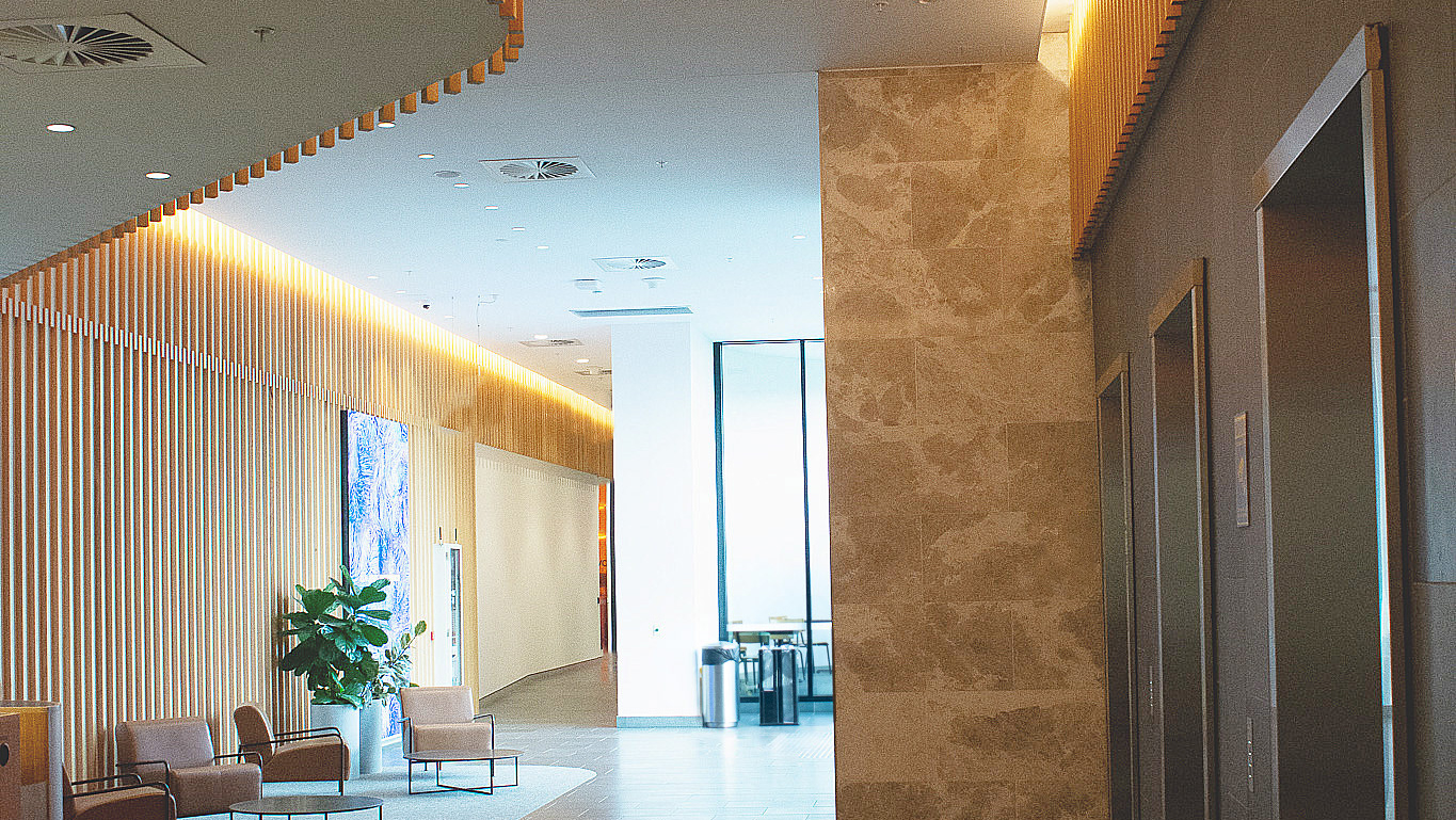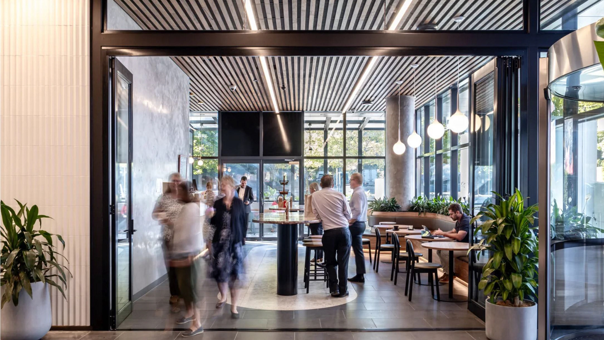Contemporary light fittings complement the new material palette, reinforcing the shift from polished steel and dark surfaces to warm timbers, soft furnishings, and tactile finishes. The coffered ceiling integrates lighting seamlessly, improving acoustics while delivering a refined, welcoming glow that unifies the lobby, business lounge, and café.