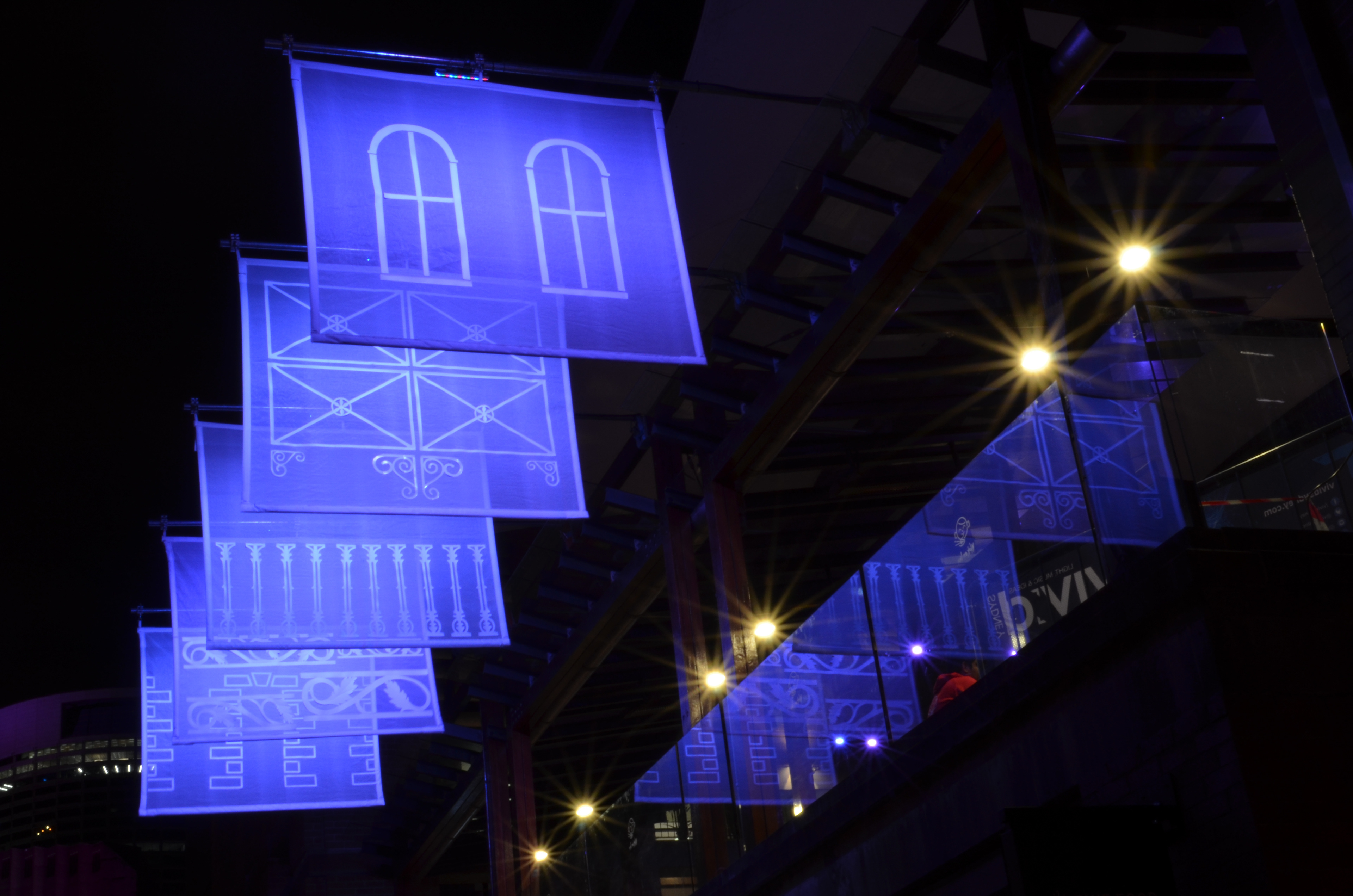 SPECTRAL HOUSE Reflects the architectural history of The Rocks by creating an imaginary and abstracted 'house' complete with old-style rounded windows, a cast-iron balcony, ornate gates, decorative architectural details and traditional masonry. The specter of the past is present in every street and building in The Rocks, and its narrow crooked streets and antique buildings have often been likened to those of old London. Although the ghostly house created by this hi-tech art-work has never existed, its many architectural details are authentic to the place and the period.