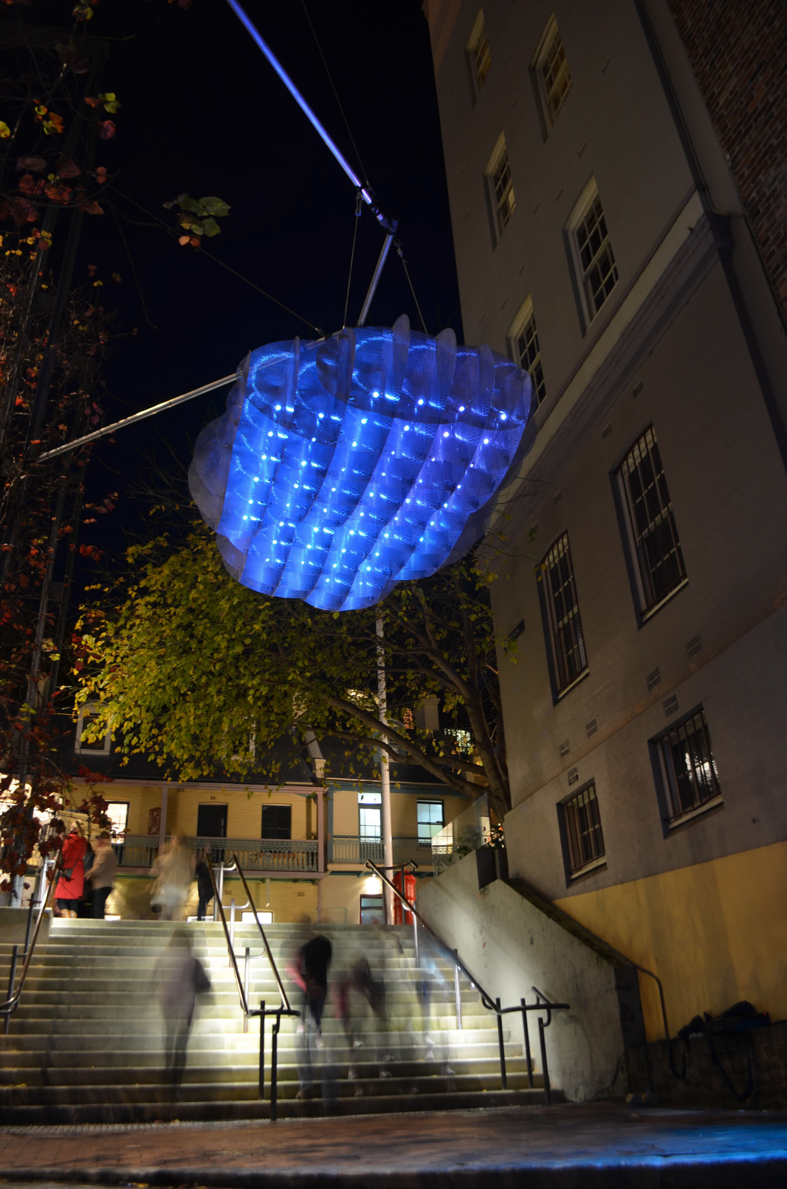 ''McDermott Baxter’s Cumulus installation is a notable contribution to the ‘smart light cities’ movement that has galvanised public art, urban design and architecture via electro luminescent (digitally controlled) systems of illumination. This inflated, colour-changing form, representing a cloud and suspended above historic stone steps in central Sydney, alludes to both today’s challenges of reforming human destructions of natural environments and the globally dominant wireless networking paradigm of ‘cloud’ computing" Davina Jackson, editor, Superlux: Smart Light Art, Design and Architecture for Cities, Thames & Hudson, 2015