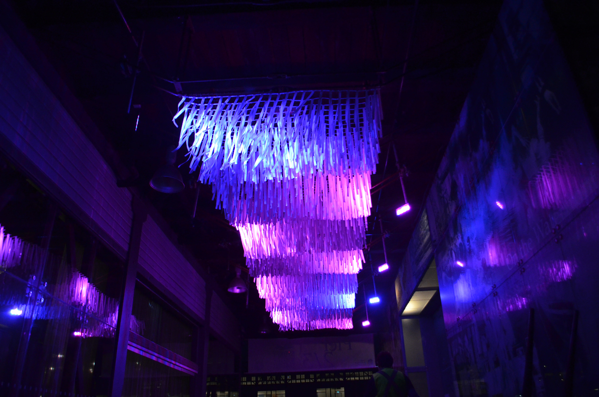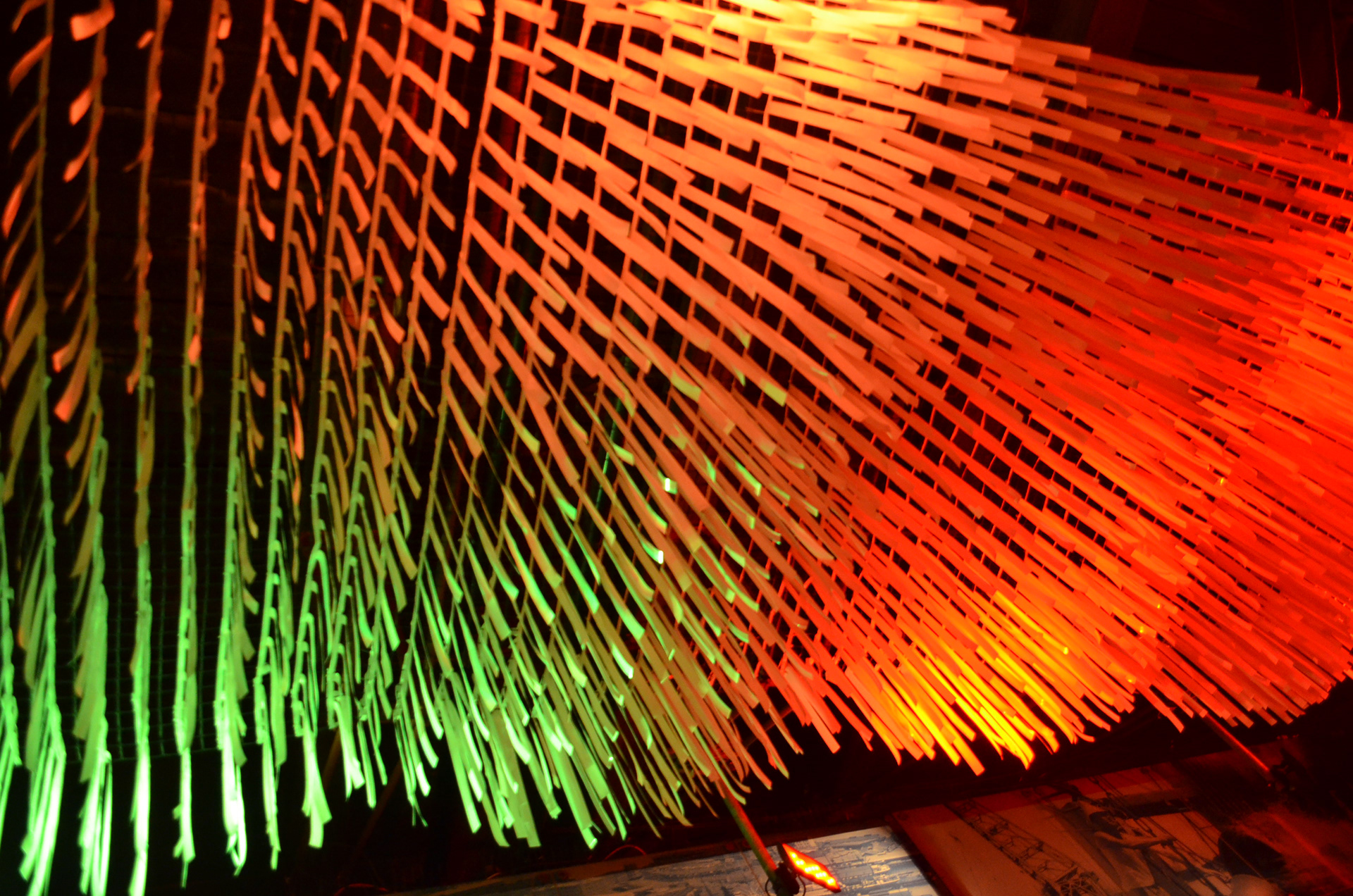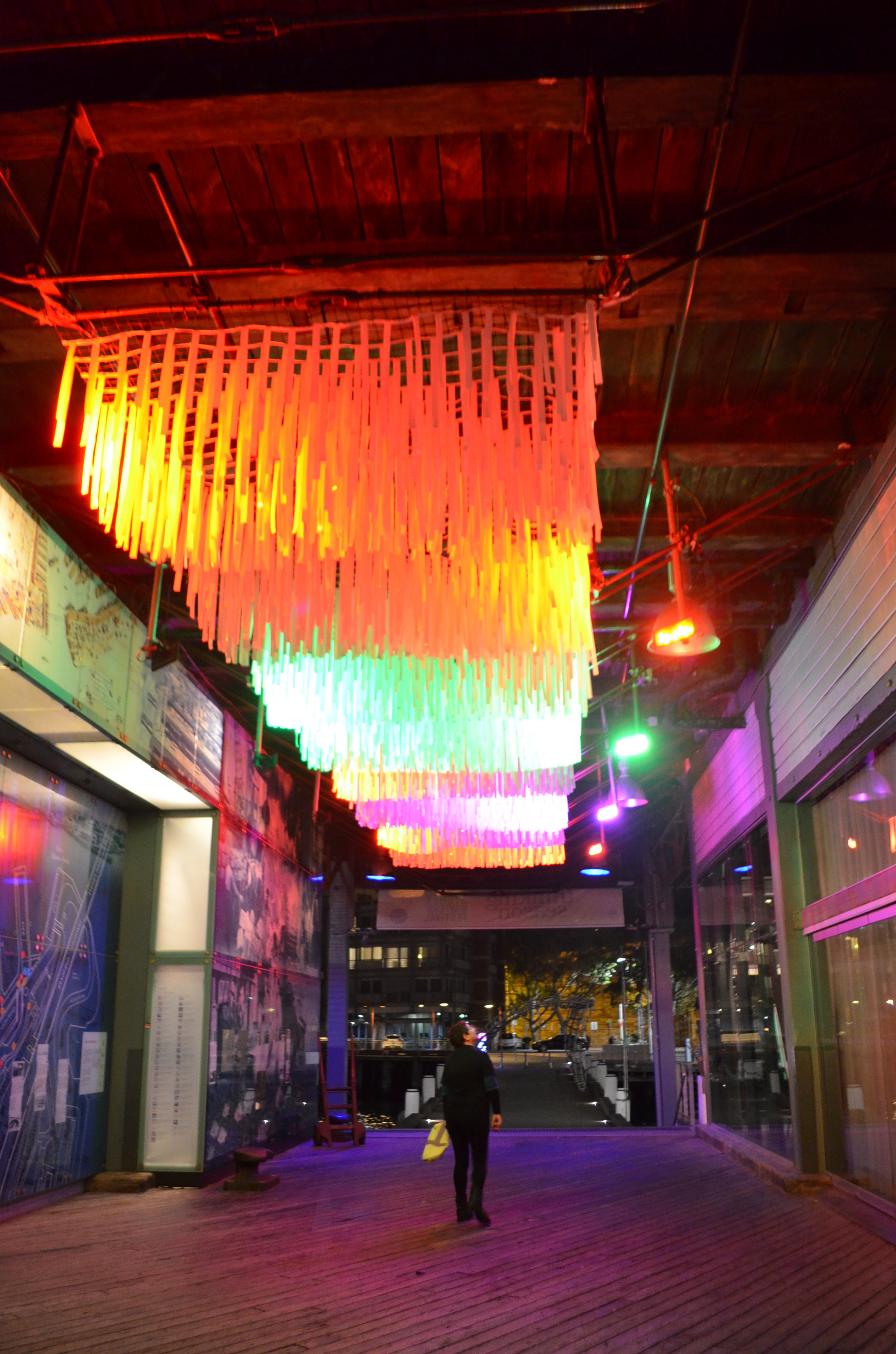 Luminous Canopy creates dynamic patterns, textures and forms in response to changes in the wind. Participants pass underneath and hear a soundscape and are immersed by colour. The canopy is made from 10,000 translucent and reflective streamers which are illuminated by a RGB LED Over a walkway at Walsh Bay hangs a canopy made from a large net, from which 10,000 streamer elements are suspended, each 400 mm long. The streamers are made from a mixture of translucent and reflective white lightweight materials. LED lights programmed to change colour illuminate the canopy from both sides. As participants pass underneath, they hear tones from a natural soundscape and, looking up, see colour and changing surface patterns linked to the movements of the breeze.