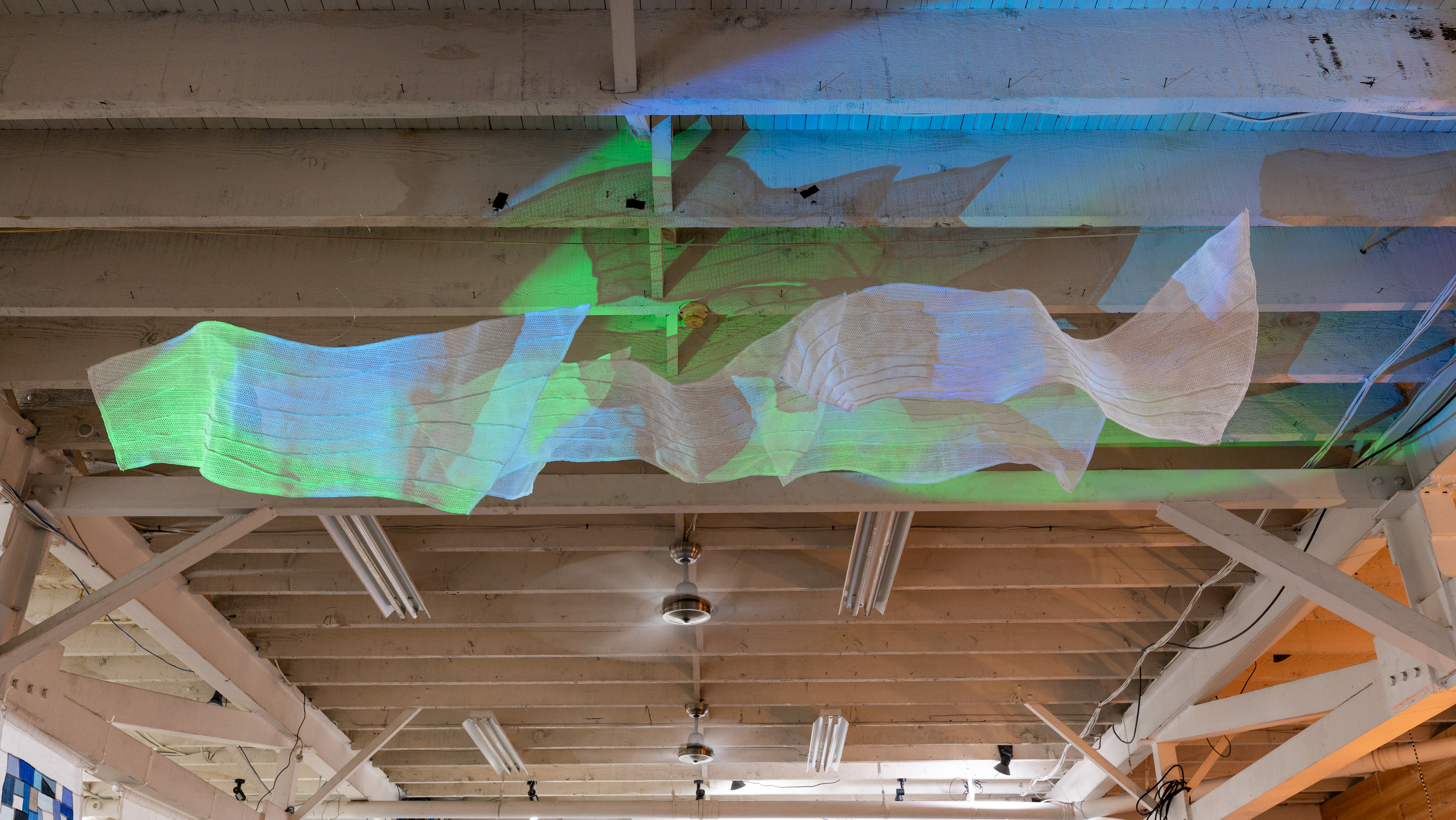 Materials: Embossed textile, acrylic & metal light-boxes.
