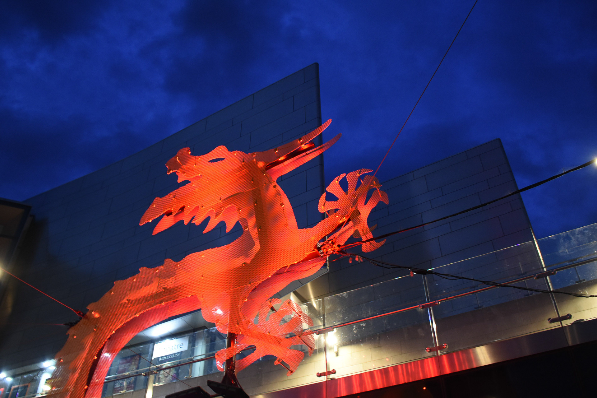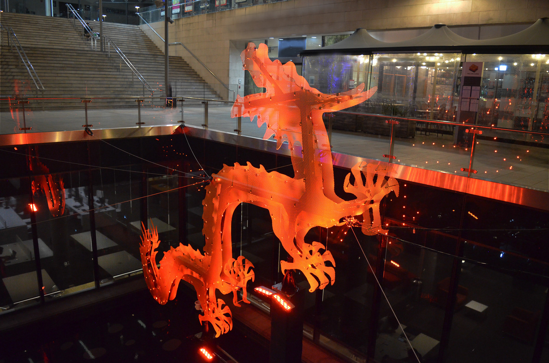 ‘Soaring Dragon’ had a double skin of perforated aluminium internally illuminated with programable LMX nodes. The double skin created a ‘moire’ effect and added to the structural integrity. The perforated aluminium was gold anodized for daytime presence and more reflectivity at night. ‘Soaring Dragon’ was 6.5m long