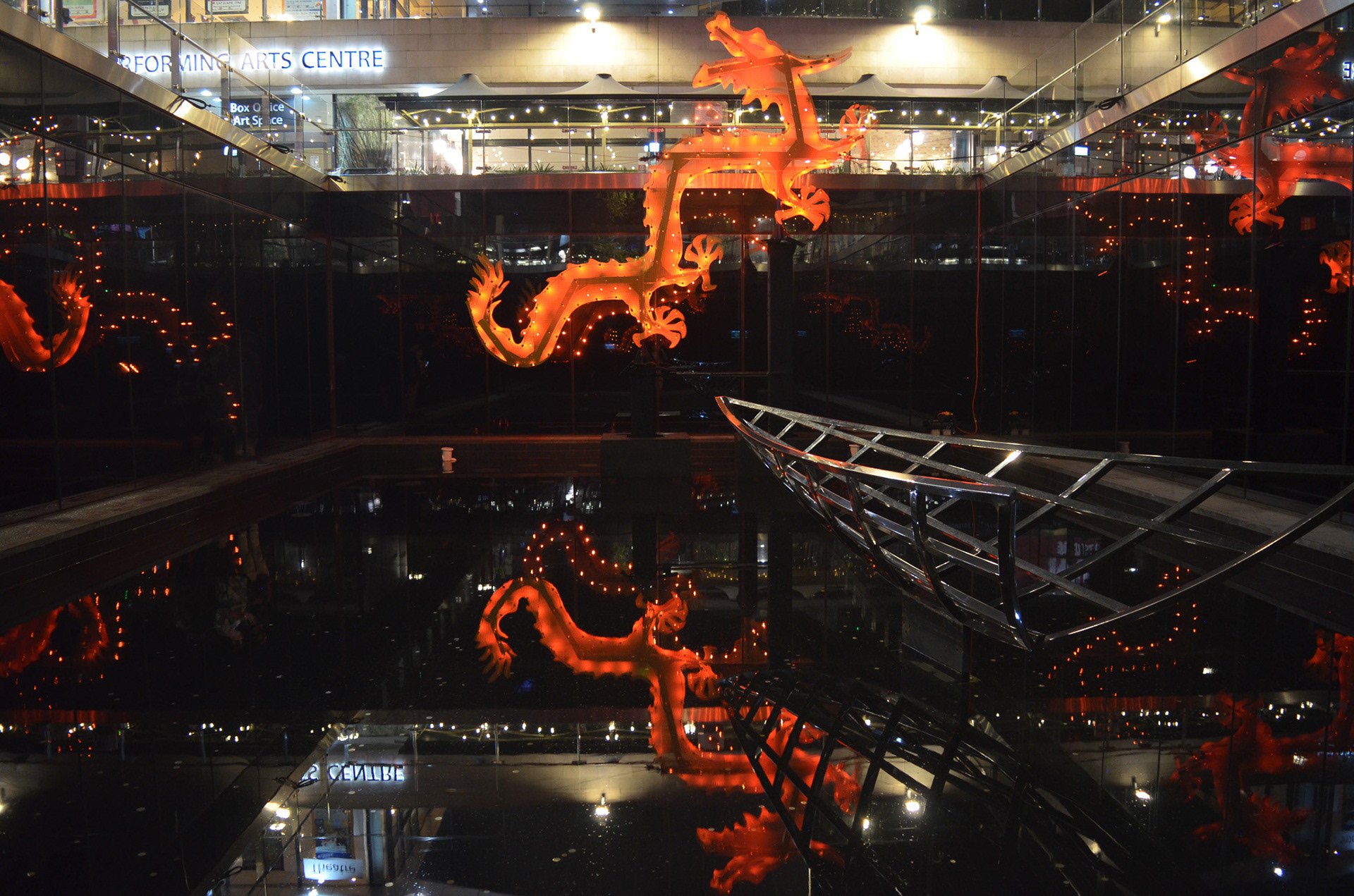 Dragons in the Chinese horoscope are traditionally associated with divinity, power and the ability to control weather. Often seen on the robe of emperors, nearly all depictions show them soaring into the sky or emerging from the sea. Whilst connected with tempests, they also bring peace and are benign deities not like the Western fire breathing dragons and they do not have wings. We wanted the dragon to appear to be emerging from the reflection pool on the lower level of the Concourse and flying off into the clouds thus creating a connection between water and sky.