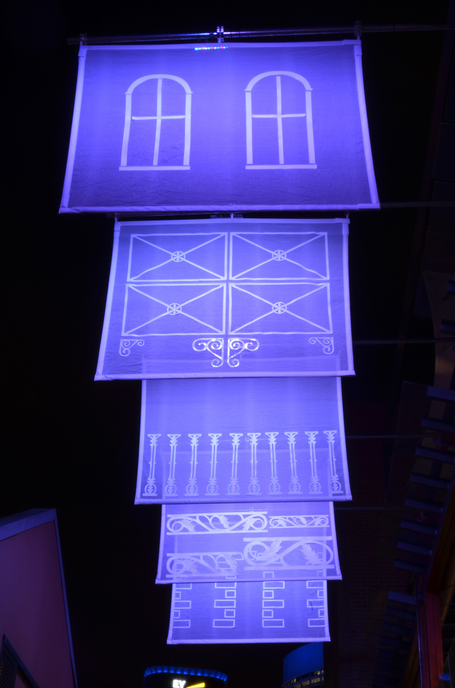 Spectral House Reflects the architectural history of The Rocks by creating an imaginary and abstracted 'house' complete with old-style rounded windows, a cast-iron balcony, ornate gates, decorative architectural details and traditional masonry. The specter of the past is present in every street and building in The Rocks, and its narrow crooked streets and antique buildings have often been likened to those of old London. Although the ghostly house created by this hi-tech art-work has never existed, its many architectural details are authentic to the place and the period. Rigged and light focused in in 5 1/2 hours.