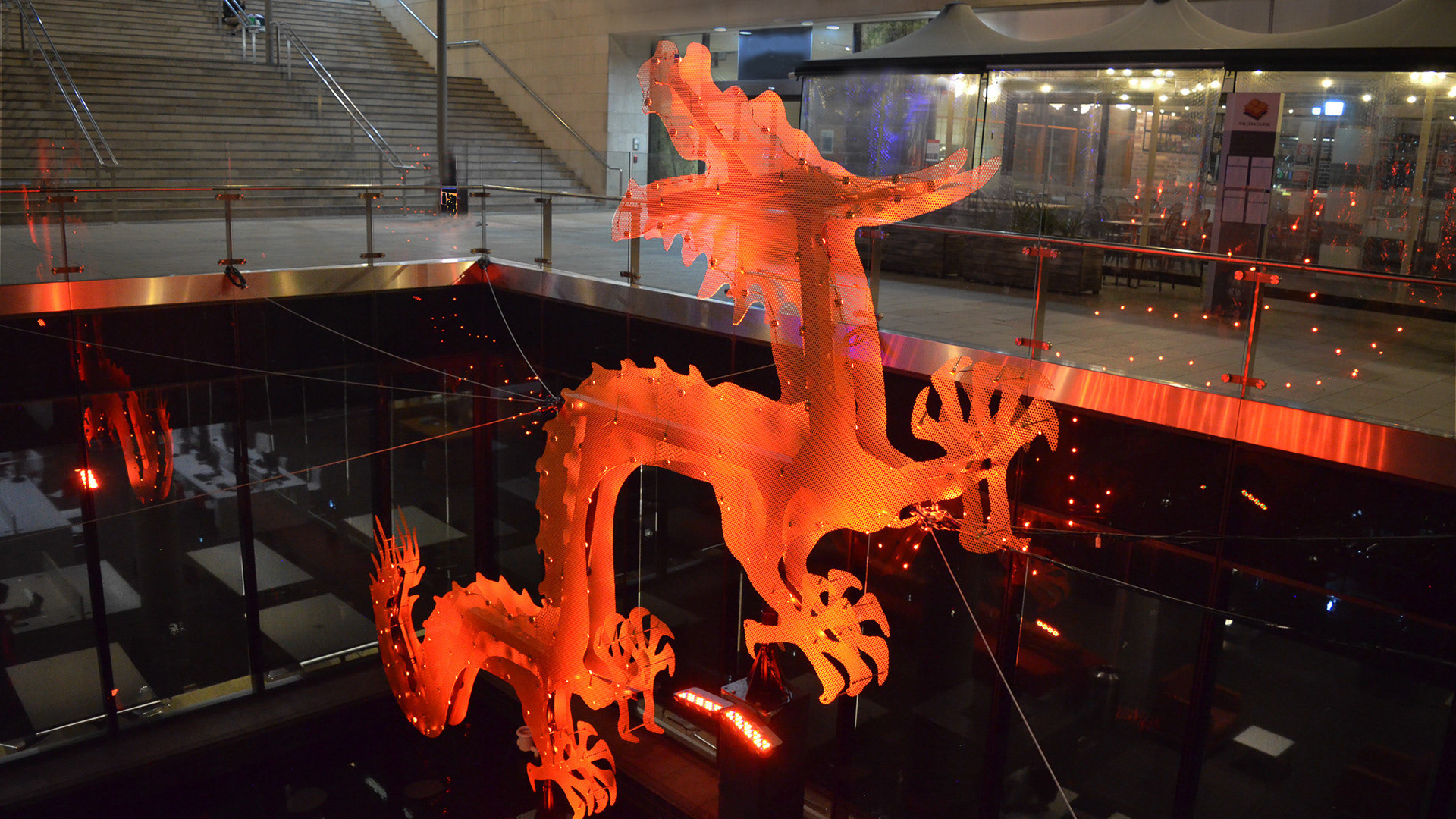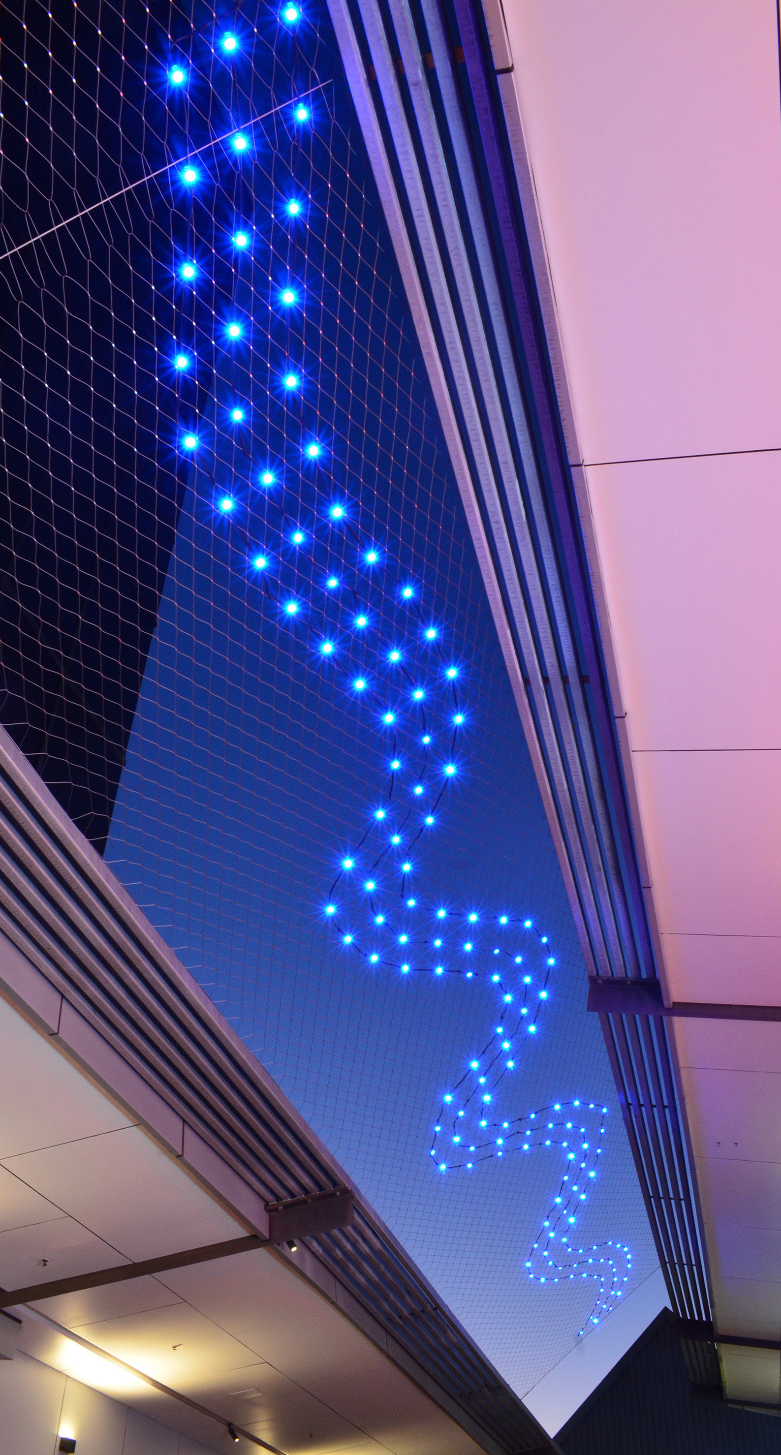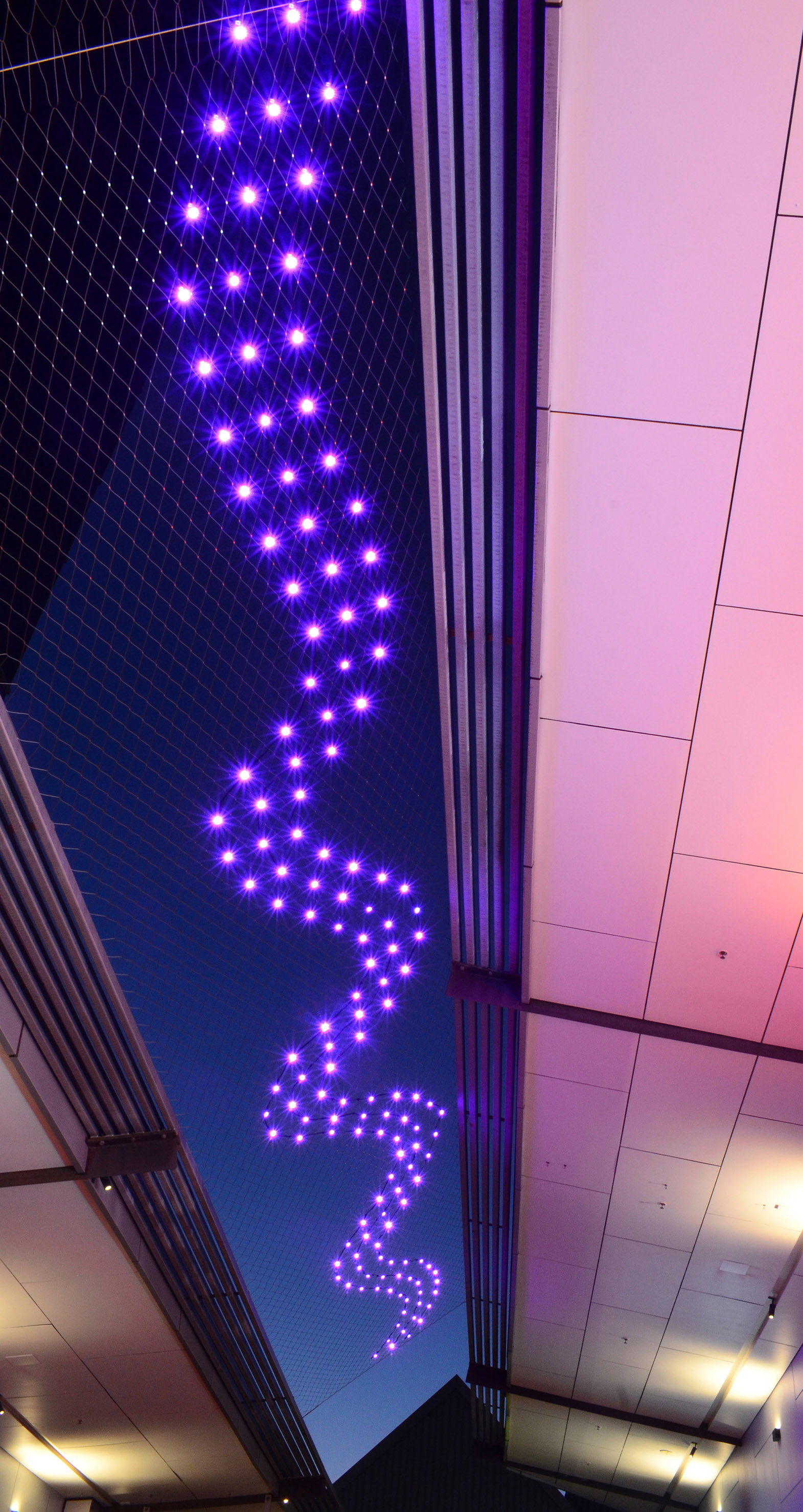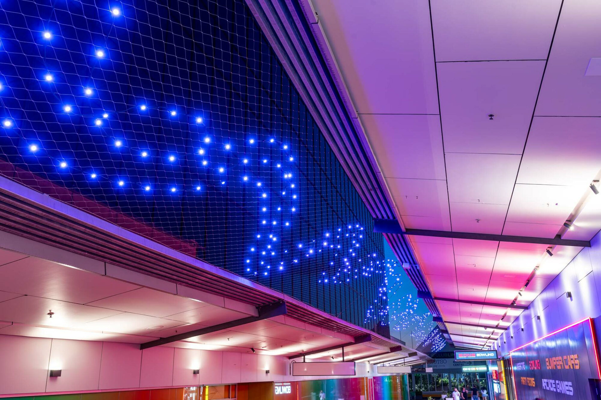 While Sydney is known for the harbour and inlets on the coast and the mighty rivers that move through the city, there are other less obvious waterways which have flowed for thousands of years across Western Sydney offering sustenance to many generations. Long ignored these waterways are now being revived and cultivated –their value finally being recognised in a environment of climate change and respect for our resources. ‘Waterscape’ is made of colour changing LMX technology mounted on an architectural mesh. Photography mcdermott baxter & Enzo Amato
